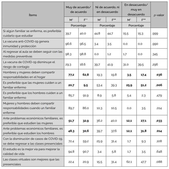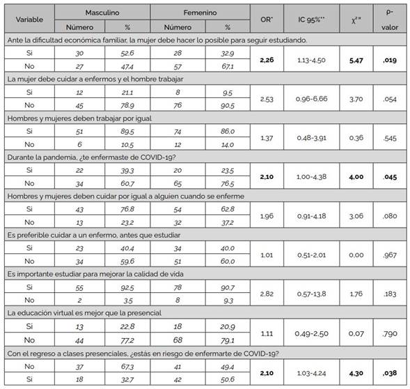 El análisis inferencial entre las variables incluidas en el estudio, tomando en cuenta, el punto de vista, tanto de hombres y mujeres, se encuentra descrito en la Tabla 2. En primer término, se observa que el 52,6 % de los hombres y el 32,9 % de las mujeres señalaron estar de acuerdo o muy de acuerdo que, ante los problemas económicos de la familia, las mujeres deben ser quienes, preferentemente hagan lo posible por seguir estudiando, por lo tanto, el sentido de opinión de un hombre sobre la acepción positiva de la variable fue más de dos veces (OR=2,26) con relación a una mujer. Este aspecto es muy similar a lo reportado en otros estudios donde, ante las dificultades económicas, el varón tiende a interrumpir sus estudios para apoyar a la familia como proveedor.