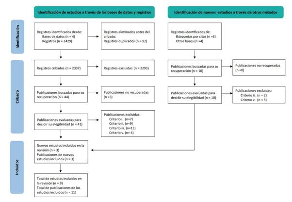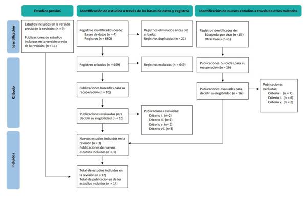 La búsqueda realizada durante septiembre de 2021 resultó en un total de 2.429 registros, a los que se añadieron 10 más a través de la búsqueda adicional. En la Figura 1 se puede observar en detalle el procedimiento de identificación y selección de los estudios en esta instancia. En la búsqueda replicada en octubre de 2022 se encontraron 680 registros; en la búsqueda complementaria, se sumaron 16 publicaciones más. En la Figura 2 se puede observar el procedimiento de identificación y selección de los estudios de esta segunda búsqueda que, integrada con la anterior, derivó en la inclusión final de 14 publicaciones que reportan un total de 12 propuestas diseñadas e implementadas, con el fin de enseñar a comprender textos en la escuela secundaria.