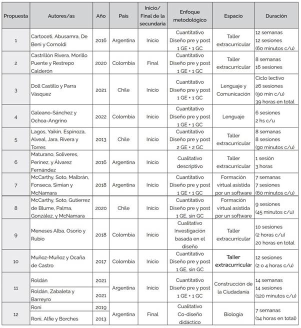 Finalmente, Roldán & Zabaleta (2021) revisaron 26 estudios implementados tanto en el nivel primario como secundario en español y los clasificaron según la modalidad de intervención: infusiva, aditiva o intermedia (Tellez, 2005). Pese a la amplia variedad de estrategias y recursos relevados, los autores concluyeron la necesidad de intensificar la investigación con población hispanohablante en la escuela secundaria, dado el número limitado de estudios encontrados en este nivel.