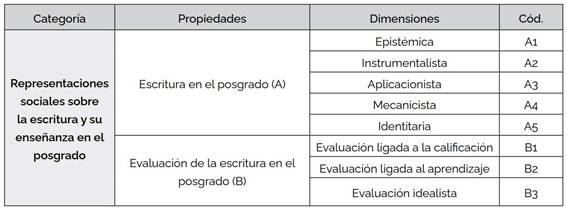 La administración de las entrevistas fue posible gracias a la colaboración de las autoridades académicas de la facultad, que habilitaron el acceso y facilitaron datos para contactar a los participantes. El diseño de análisis fue elaborado con base en la Teoría Fundamentada (Strauss & Corbin, 1998), dado que el proceso de conceptualización procede de los datos resultantes en la investigación. Luego de identificar y relacionar categorías centrales en la información relevada, aplicamos el método de comparación constante, de la teoría con los resultados tanto como al interior de estos últimos. La Tabla 1 sistematiza los datos empíricos en categorías, propiedades y dimensiones. Las categorías conforman conceptos derivados de los datos que representan el fenómeno. Las propiedades constituyen atributos de esa categoría y las dimensiones representan la localización de cada propiedad durante un continuo, cuyo rango de variación permitió aumentar el conocimiento en torno a las representaciones sociales sobre la escritura y su evaluación.