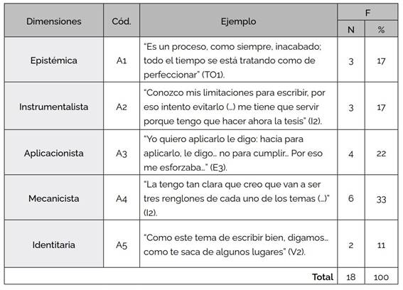 Es por eso que ayudar a construir identidad discursiva requiere valorar el proceso del propio estudiante y, en ese recorrido, identificar sus representaciones acerca de la escritura. Esta tarea no está exenta de dificultades porque el imaginario social es heterogéneo por naturaleza. Mientras en algunos cursantes persiste una idea procesual -que guarda consigo una concepción epistémica de la escritura- (“es un proceso, como siempre, inacabado; todo el tiempo se está tratando como de perfeccionar”) (TO1) (A1, Tabla 3), en otros aparece una idea mecanicista: “la tengo tan clara que creo que van a ser tres renglones de cada uno de los temas. Entonces, cuando presente mi tesis van a ser cinco, va, el Plan de Tesis fueron doce hojas, y yo la tesis… treinta (risas)” (I2) (A4, Tabla 3).