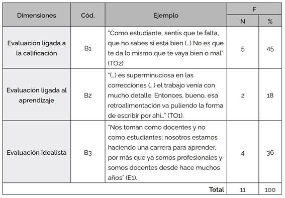 Respecto a las representaciones sociales sobre la evaluación de la escritura (B) -cuyas definiciones operacionales constan en la Tabla 2-, la mayor parte de las respuestas (45 %), sistematizadas en la Tabla 4, considera a la evaluación ligada a la acreditación (B1). Seguido a ello, el 36 % hace referencia a sus dificultades para comprender las propuestas docentes en educación, así como también construyen una representación de evaluación ligada a un ideal (B3). El 18 % asume a la evaluación de la escritura como un proceso interactivo de aprendizaje (B2).