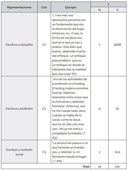 Con respecto al objetivo 2 de este trabajo, relativo a las características de las trayectorias en el posgrado (Tabla 5), observamos que sus representaciones sobre la escritura varían de acuerdo con sus experiencias en torno a esta práctica. Estas últimas no solamente se vinculan con la disciplina (medicina, enfermería, terapia ocupacional, veterinaria, psicología e ingeniería), sino también con la profesión que ejercen y el contexto social en donde se circunscriben. De un total de 18 ocurrencias, 7 respuestas (38.88 %) asociaron la escritura con la disciplina en sus carreras de grado (C1). A su vez, 9 respuestas (50 %) otorgan relevancia al ejercicio profesional de la escritura (laboral, docente, investigativo) luego de graduarse (C2). Por último, en dos ocasiones (11.11 %) se aludió al contexto social en que se circunscriben y/o lo hicieron en el pasado.
