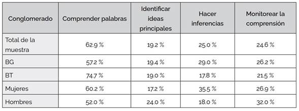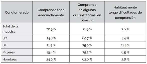 De acuerdo con lo que se distingue en la tabla, una gran parte de la muestra señala tener dificultades para comprender el significado de algunas palabras. Esto, aparte de reflejar lo limitado que puede estar su vocabulario, fenómeno asociado con factores como una memoria limitada, a su vez, afectada por prácticas vernáculas (por ejemplo, leer textos atomizados tipo mensaje de red social), provee información sobre las otras áreas de dificultad, aunque en la percepción de la muestra no esté declarado. Por ejemplo, si no se conoce el significado de palabras en un texto, seguramente se ve también afectada la capacidad para identificar ideas principales.