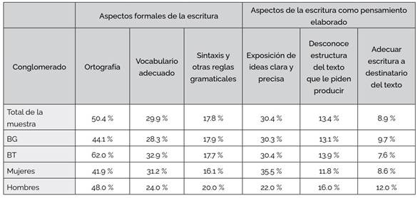 La Tabla 3, donde se agrupan los datos referidos a la percepción general como escritores, permite apreciar cómo casi la mitad de las/los estudiantes del BG declara tener dificultades, mientras en el caso del BT esta proporción es superior al 60 %. Cabe suponer que la concepción de la escritura que tienen estos(as) estudiantes es básicamente la de agrupar información en un texto, por encima de comunicar ideas y organizarlas en este. Igualmente, parece prevalecer la idea de que la redacción refiere más al cuidado de aspectos de forma que de construcción y comunicación de ideas.