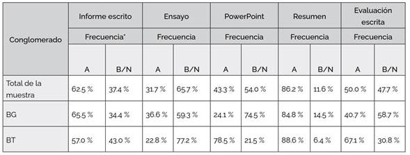 En cuanto a la evaluación escrita, es mucho mayor la frecuencia con que se solicita entre estudiantes del BG, con una diferencia de más de 20 puntos porcentuales respecto al BT. Sin precisar el tipo de evaluaciones que se llevan a cabo ni sus características, este solo dato aporta la idea de una diferencia sustancial en las prácticas con que se valora lo aprendido por las/los estudiantes en cada contexto. Respecto a este punto, al señalarse el tipo de texto como “evaluaciones escritas”, los datos permiten afirmar que en el caso del BG se impone una mayor actividad de lectura y escritura con esta práctica, dado que para responder un examen, por ejemplo, se tiene que leer una diversidad de informaciones (instrucciones, tipo de respuesta ―si se trata de relacionar concepto con definición, opción múltiple, abierta―, fragmentos de texto que se incluyen como fórmulas o textos breves…) y generar una respuesta escrita, ya sea producto de la asociación de ideas, la exposición de un procedimiento o algoritmo matemático o algún ejercicio a partir de cierto texto breve, como la paráfrasis o la explicación, por ejemplo.