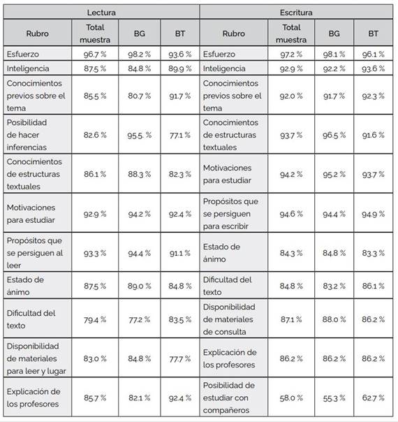 La tabla anterior concentra cerca de una docena de aspectos que dentro de su actividad escolar cotidiana son atribuidos desde la percepción de las/los estudiantes a un buen desempeño lector y escritor. Esta tabla incluye factores de diverso orden, de acuerdo con lo que se demanda a la persona: cognitivo-lingüístico, en tanto refiere a conocimientos previos sobre un tema o a identificar estructuras textuales, por ejemplo; emocional-actitudinal, en atributos como el esfuerzo o el estado de ánimo, y situacional-social, entre los que destaca la disponibilidad de materiales para leer y la posibilidad de hacerlo como parte de la actividad de estudiar junto a otros compañeros.