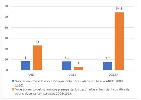 Es importante resaltar aquí que debido al carácter global en el que se expresan los montos no fue posible desagregarlos según se trate de docentes que cumplen tareas de aula (directas) o de docencia indirecta (Ej.: supervisores, directores, docentes que cumplen tareas de apoyo). Sin embargo, debemos considerar que según ANEP (2020), el 93,4 % de los docentes del organismo están afectados a tareas de docencia directa.