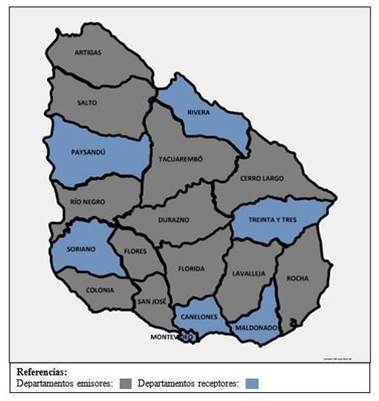 En tanto que, siete departamentos son, fundamentalmente, receptores: Canelones, Montevideo, Paysandú, Treinta y Tres, Soriano, Maldonado y Rivera. En este grupo, los departamentos con el porcentaje positivo más pronunciado son Montevideo (18,1) Canelones (16,6), Paysandú (6,6) y Maldonado (6,1).