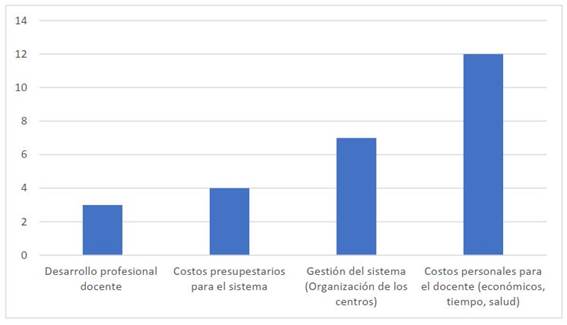 Tal como se muestra en la Figura 3, para los y las participantes los efectos de la movilidad geográfica docente recaen fundamentalmente sobre aquellas dimensiones que podríamos identificar como más relacionadas con el cuerpo docente, como lo son, “Desarrollo profesional docente” y “Costos personales para el docente”. La segunda respuesta más usual se relaciona con la “Gestión del sistema”.