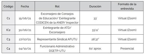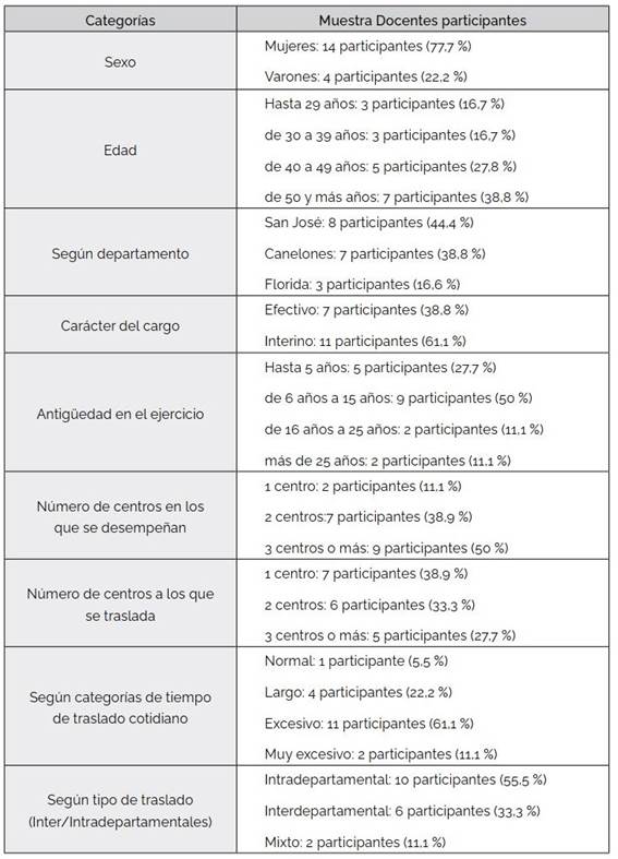 Para el análisis cualitativo, se realizaron 18 entrevistas semiestructuradas a docentes de aula de la DGETP-UTU de instituciones de los departamentos de Canelones, Florida y San José. La muestra de docentes participantes fue no probabilística o dirigida.