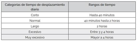 En la Tabla 3, se presentan las cinco categorías de tiempo de desplazamiento diario y los rangos temporales utilizados para definirlas. Los puntos de corte fueron establecidos a partir de la base de datos del Censo Nacional Docente de la ANEP 2018 (ANEP, 2020).