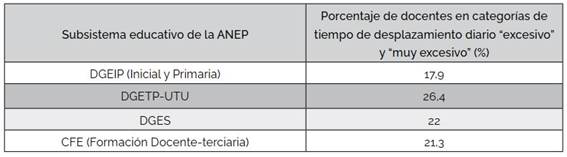 Tal como surge de la Tabla 4, es en la enseñanza media (DGES y DGETP-UTU), donde se encuentran los porcentajes de docentes más elevados dentro de las categorías de tiempo de desplazamiento diario “excesivo” y “muy excesivo”.