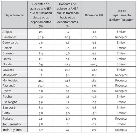 En cambio, los departamentos receptores son aquellos en que el porcentaje de docentes residentes que se desplazan a centros educativos ubicados en otros departamentos es menor al porcentaje de docentes provenientes de otros departamentos. Es decir que reciben más docentes que los que ceden. (González Alemán, 2022, p. 81).
