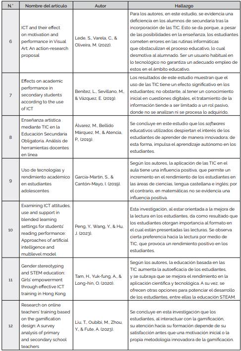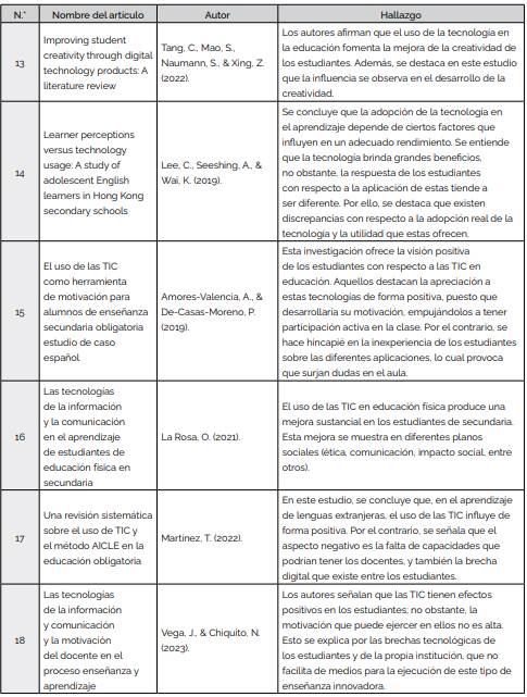 En la selección de los artículos, el año de publicación permitió que esta investigación tenga actualidad no solo en las temáticas desarrolladas, sino también en los aportes que cada uno provee (Tabla 2). Así, los artículos encontrados durante 2019 representan un 33 %; mientras que los trabajos hallados en 2020 engloban el 11 %. Asimismo, las investigaciones del 2021 abarcan solo un 6 %, siendo el año que menos trabajos publicados con base en las TIC en nivel de secundaria. Finalmente, el año 2023 engloba un 17 % de artículos encontrados.