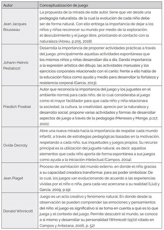Si se hiciera una retrospección de como el término juego ha hecho su recorrido a lo largo de la historia educativa a nivel preescolar o educación parvularia se puede entregar las siguientes referencias de acuerdo a distintos autores que han entregado conocimiento de este término, en la Tabla 1 se encuentra un resumen de algunos de ellos: