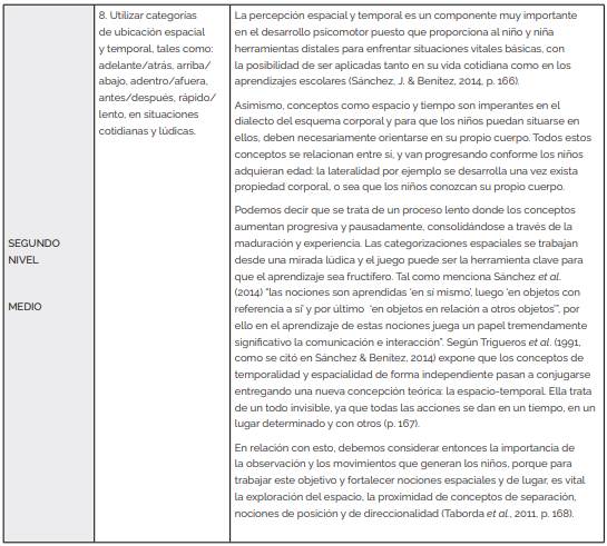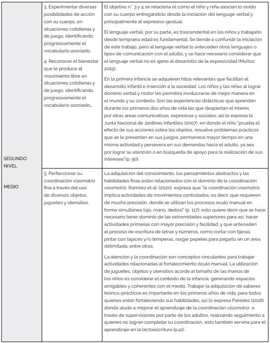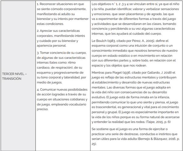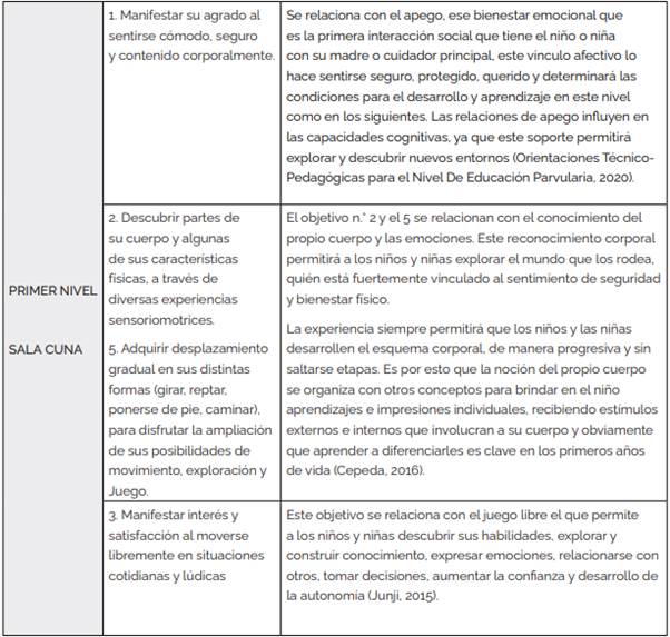 Por lo cual, reflexionar desde una mirada analítica sobre la orientación conceptual que entrega cada objetivo de aprendizaje en el núcleo corporalidad y movimiento ayudará a abordar pedagógicamente de forma oportuna y significativa en cada experiencia de aprendizaje pensada desde el movimiento, para cada nivel que incorpora la educación inicial en infancia (primer nivel: sala cuna; segundo nivel: medio; tercer nivel: transición). Otorgando así, experiencias educativas propicias y fundamentadas desde la teoría, respetando cada desarrollo bio-psico-social de los niños y niñas insertos en las aulas chilenas.