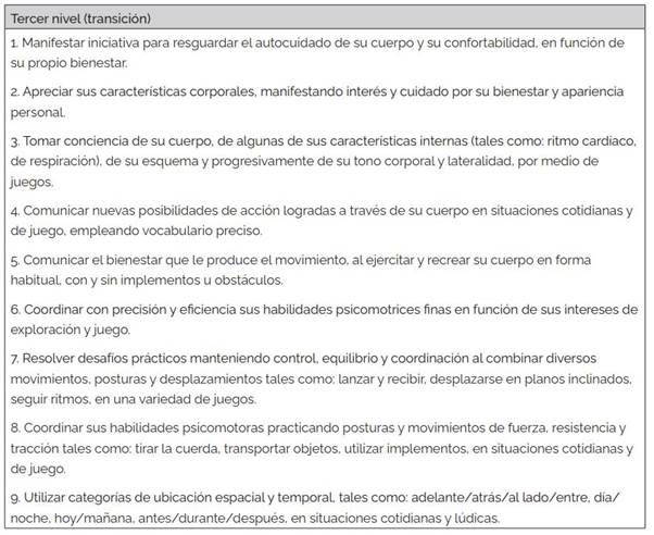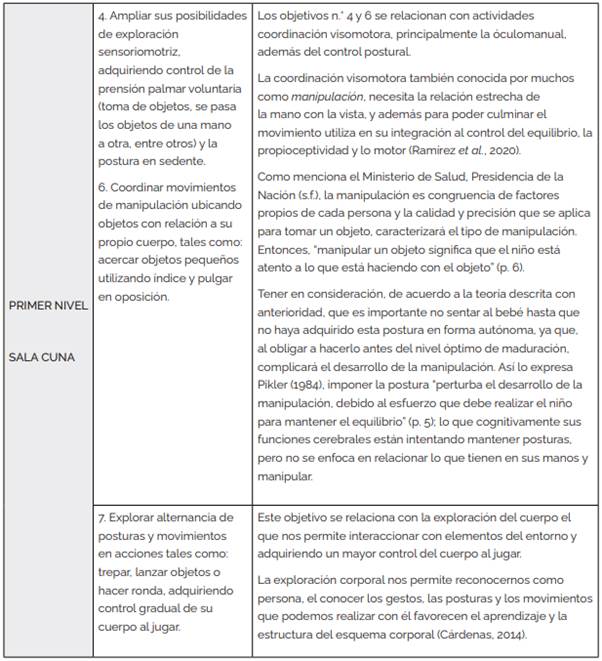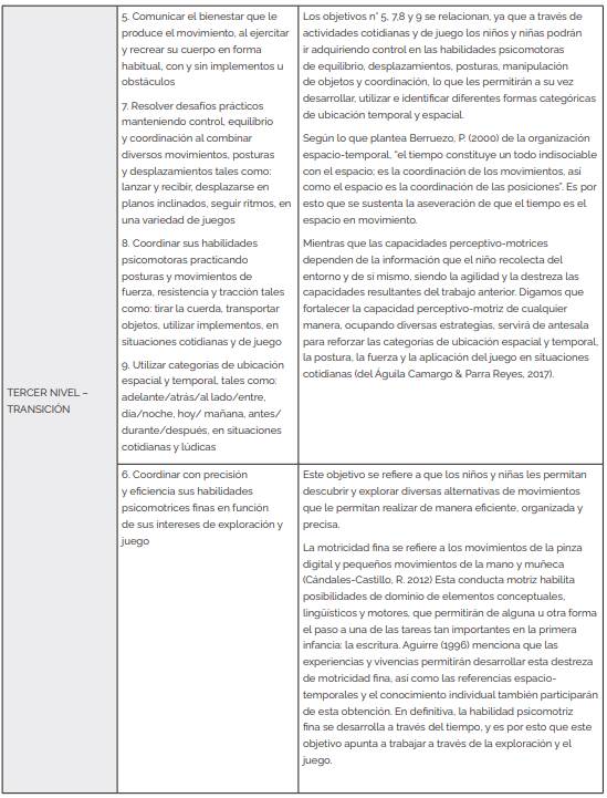 En las Tablas 5, 6 y 7 se puede observar cada nivel de Educación Parvularia, con sus objetivos de aprendizajes para cada uno, y analizados desde una mirada motriz y psicomotriz, reconociendo así su importancia en la consecución de cada uno de ellos.