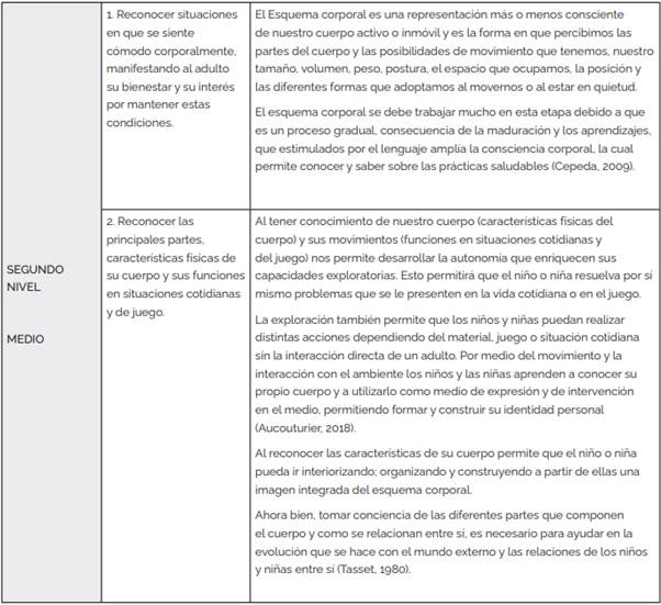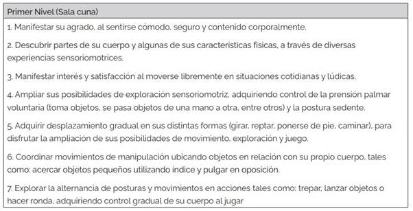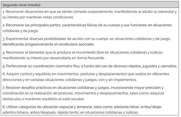 …espera potenciar en las niñas y los niños, habilidades, actitudes y conocimientos que les permitan reconocer y apreciar sus atributos corporales, descubrir sus posibilidades motrices, adquirir una progresiva autonomía para desplazarse y moverse, y que contribuyan a expandir sus procesos de pensamiento, satisfacer sus intereses de exploración, fortalecer su identidad, resolver problemas prácticos y expresar su creatividad. (Mineduc, 2018, p. 61)