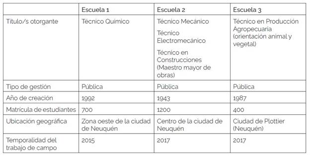En nuestra investigación en particular, realizamos un estudio cualitativo basado en un estudio de casos en tres escuelas técnicas de Neuquén; escuelas que presentan sus particularidades y especificidades.