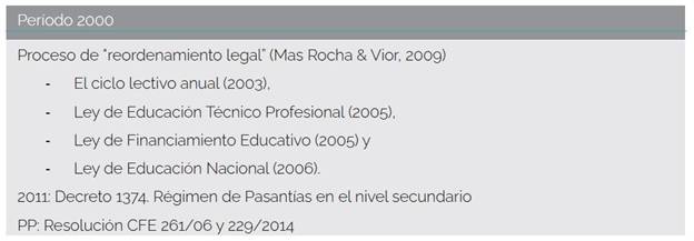 Con la gestión de Néstor Kirchner al gobierno nacional, en el 2003, comienza un proceso de “reordenamiento legal” (Mas Rocha y Vior, 2009) donde se impulsan reformas a las estipuladas en la década anterior, que implicó, entre otras, la extensión de la obligatoriedad de la enseñanza secundaria y una reestructuración curricular y gradual.