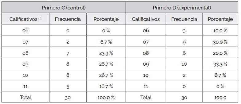 En general, como se observa en la Tabla 1, los estudiantes de ambas secciones mostraron un bajo rendimiento. Solo 5 de 60 estudiantes aprobaron. Además, los promedios de los primeros C y D son respectivamente, 9.23 y 7.97, por lo que se determinaron como grupos control y experimental al primero C y D, respectivamente.