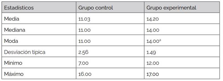 Se observa una diferencia de 3.17 en la media, a favor del grupo experimental. Además, en el grupo experimental el puntaje máximo es mayor y la desviación típica es menor, que en el grupo control.