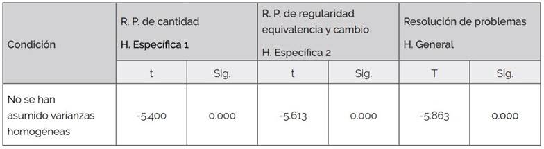 En las pruebas de resolución de problemas de cantidad, resolución de problemas de regularidad, equivalencia y cambio, así como en la competencia resuelve problemas, tal como se observa en la Tabla 3, los p-valor (Sig.) son menores a 0.05 por lo que se deduce que existe evidencia estadística que la diferencia de medias es significativa, a favor del grupo experimental.