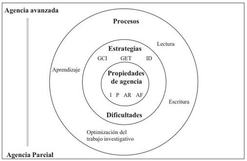 Las propiedades de agencia implicadas en el desarrollo de la investigación doctoral son: intencionalidad, previsión, autorregulación y autorreflexión.