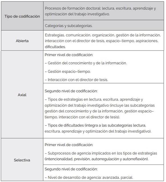 Acorde con el objetivo de la investigación, las respuestas fueron analizadas a profundidad mediante un proceso inductivo que integra la codificación abierta, axial y selectiva, correspondientes a la teoría fundamentada (Strauss & Corbin, 1998), enfocado en la comprensión de las estrategias aplicadas con un sentido de agencia por doctorandos de distintas disciplinas para el desarrollo de la lectura y escritura académicas, el aprendizaje y la optimización del trabajo investigativo.