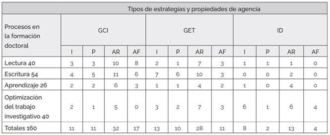 En la Tabla 2, se presenta el número de evidencias de las propiedades de agencia que se identificaron en las distintas estrategias utilizadas por los doctorandos en función de los procesos de la formación doctoral en que se presentan.