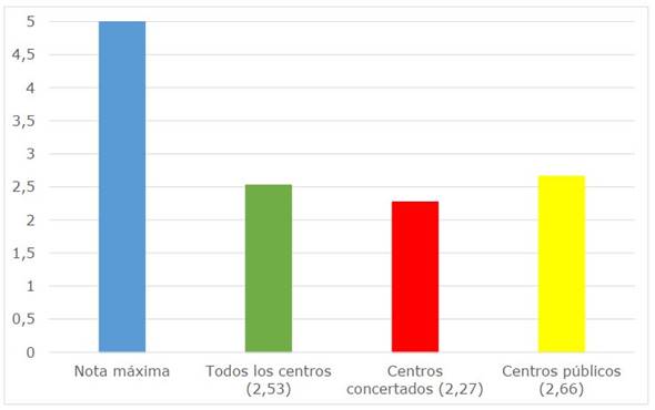La tercera columna muestra la puntuación obtenida de los centros educativos concertados y privados, que apenas alcanza la mitad de la puntuación media. Su muestra es de 46 alumnos y alumnas y no diferencia el género del alumnado.