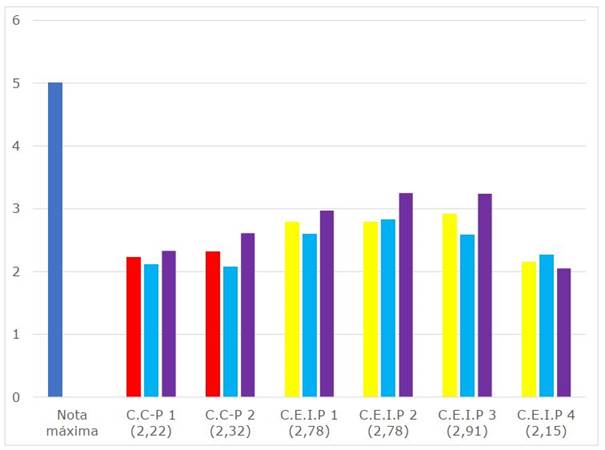 La Figura 1 muestra todas las puntuaciones obtenidas en el estudio realizado de forma que, en la primera columna encontramos la nota máxima sobre la que se ha evaluado.
