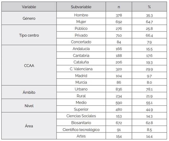 A partir de un universo de 984.353 estudiantes de ciclos formativos de España, se seleccionaron 1.070 estudiantes de 13 centros educativos (ver Tabla 1) con edades comprendidas entre los 15 y los 53 años (x = 21.09; DT = 6.1) a través de un muestreo aleatorio simple (nivel de confianza 99 %; margen de error 5 %). Se realizó una investigación mixta a través de un diseño descriptivo, no experimental y transversal.