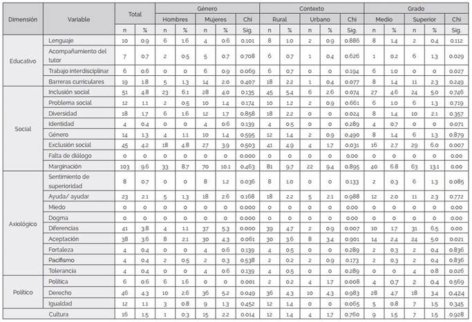 En referencia al ámbito geográfico, los datos mostraron que el alumnado de ámbito rural se refiere en mayor medida que los de zonas urbanas todas las categorías excepto en las de: pacifismo, política, derecho y cultura. No obstante, tras realizar la prueba de χ2 se advirtió que el valor de la significancia fue inferior a 0.05 respecto a las variables: exclusión social, falta de diálogo, miedo, dogma, diferencias y política (ver Tabla 2); lo cual indica que estas variables no son significativas.