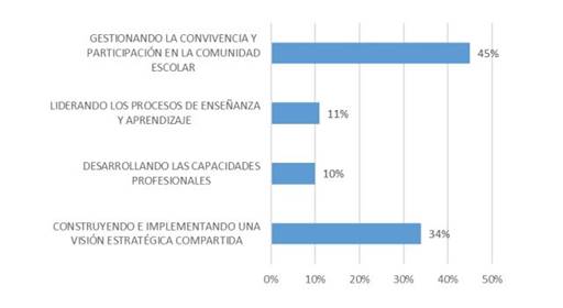Los resultados sobre cómo gestionan el tiempo los líderes escolares de escuelas vulnerables en función de las dimensiones construir e implementar una visión compartida en la escuela, desarrollar capacidades profesionales, liderar los procesos de enseñanza y aprendizaje y gestionar la convivencia y participación en la comunidad escolar del MBDLE, dan cuenta que los equipos directivos planifican actividades en mayor medida para la gestión de la convivencia escolar (45 %) y construyendo e implementando una visión compartida en la escuela (34 %), y en menor medida para el desarrollo profesional docente (10 %) y Liderando los procesos de enseñanza y aprendizaje (11), como se observa en la Figura 2.