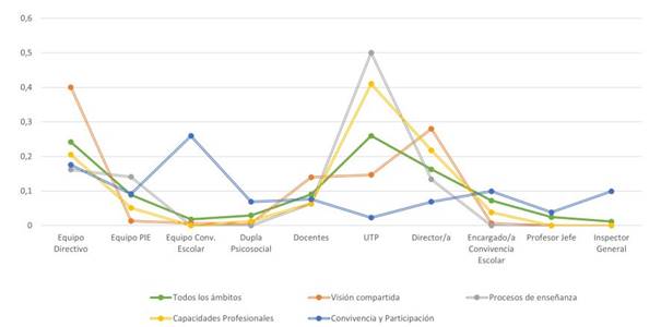 Al analizar la distribución de responsabilidad de los actores de la escuela en las actividades planificadas por los equipos directivos se visualiza, en tres de las cuatro dimensiones del MBDLE, que el responsable es el Equipo Directivo en su conjunto, y luego individualmente el o la Jefe de Unidad Técnica Pedagógica y el Director/a. Solo en la dimensión convivencia y participación escolar, el responsable es la persona encargada de Convivencia Escolar. Por el contrario, se observa baja responsabilidad del resto de los actores escolares como profesores, profesores jefes, equipo PIE, Inspector General y Dupla Psicosocial en las actividades de la escuela. Tampoco se visualiza responsabilidades en las actividades de otros miembros de la comunidad escolar como son Asistentes de la Educación, Padres y/o Apoderados, estudiantes, coordinadores de ciclo o de departamentos, entre otros (ver Figura 4).
