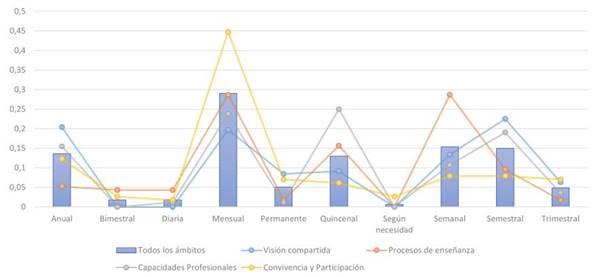 Finalmente, es importante destacar que las actividades relacionadas con la generación de una visión compartida tienen una frecuencia semestral (23 %), que evidencia que los equipos directivos de estas escuelas no han avanzado en gestionar el tiempo para generar esta visión de una forma más gradual, frecuente y sistemática, lo que es considerado la base sobre la cual se construyen los procesos y trayectorias de mejoramiento escolar.