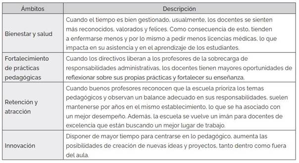 Al respecto, la investigación evidencia que los directivos escolares generalmente no reconocen el tiempo escolar como un recurso educativo dinamizador y clave de la acción pedagógica, ya que “se focalizan en el empleo cuantitativo del tiempo y en menor medida consideran una perspectiva cualitativa, es decir, contar con el tiempo para aprender a vivir comprensivamente” (Rubio et al., 2019, p. 102). Por su parte, Cabrera y Herrera (2016) reafirman que el tiempo debe ser comprendido como una dimensión crucial en la vida de las escuelas, ya que cuando se gestiona apropiadamente y se asume la responsabilidad de considerarlo como un recurso esencial y estratégico se promueve el mejoramiento de estas. Galdames (2018) plantea, como se observa en la Tabla 1, las ventajas que conlleva una buena gestión del tiempo en la escuela.