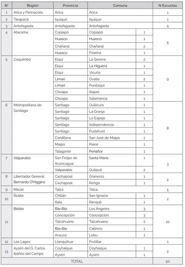 En el estudio participaron equipos directivos constituidos por directoras, directores y jefes/as de Unidades Técnicas Pedagógicas de escuelas públicas de Chile. Existen 492 escuelas en la categoría insuficiente y 8444 en medio-bajo. De ese universo, participaron en el estudio 14 escuelas categorizadas como insuficiente y 36 escuelas medio-bajo. Los criterios de inclusión fueron: adscripción al programa Sumo Primero en Terreno, categorización de desempeño insuficiente o medio bajo, acceder voluntariamente participar del estudio y cobertura geográfica con escuelas del norte, centro y sur del país. Los directores/as y jefes de las Unidades Técnicas Pedagógicas de las escuelas firmaron previamente un consentimiento informado. Chile está conformado por dieciséis unidades territoriales llamadas regiones, 56 provincias y 346 comunas. En la Tabla 2 podemos observar que los equipos directivos participantes del estudio pertenecen a escuelas de 13 regiones, 26 provincias y 37 comunas de Chile, evidenciando una amplia cobertura geográfica del país.
