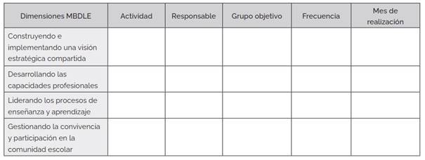 La información de este estudio fue recogida a través de una entrevista grupal (Kitzinger, 1995), aplicada a los equipos directivos (Director/a y Jefe de UTP) de 50 escuelas participantes del Programa Sumo Primero en Terreno, en el contexto del Taller Gestión del Tiempo, cuyo objetivo está vinculado a conocer la forma de gestionar el tiempo en las escuelas medio bajo o insuficiente. Para ello, durante el mes de junio del año 2020, los equipos directivos de las escuelas participantes asistieron a una instancia de reflexión sobre la gestión del tiempo escolar, proceso que fue intencionado invitándolos a planificar actividades escolares a partir de una matriz con cuatro dimensiones del MBDLE (MINEDUC, 2015) (ver Figura 1). Esta planificación se realizó tomando en cuenta frecuencia, mes de realización y responsables, con la finalidad de evidenciar un mapeo general, respecto de las prácticas de gestión del tiempo en la escuela. Una vez registrada la información los equipos reflexionaron sobre los focos prioritarios presentes en las actividades detalladas, en contraste con lo esperado respecto del uso del tiempo para la mejora de los aprendizajes. Los directivos completaron la matriz (Tabla 3) en la que registraron actividades que realizan, responsables de dichas actividades, tiempo y frecuencia.