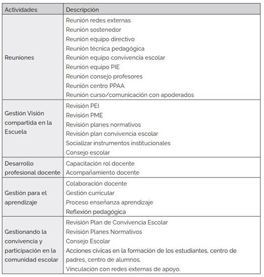 Lo anterior muestra cómo los equipos directivos planifican la mayor cantidad de actividades al comienzo o al finalizar el año escolar, cuando no se encuentra el estudiantado, ocupando ese tiempo principalmente en reuniones con docentes, viéndose imposibilitados de realizar acciones relacionadas al liderazgo pedagógico, como acompañamiento docente, observación de clases, retroalimentación de prácticas u otras relacionadas con generar instancias de participación de la comunidad educativa.