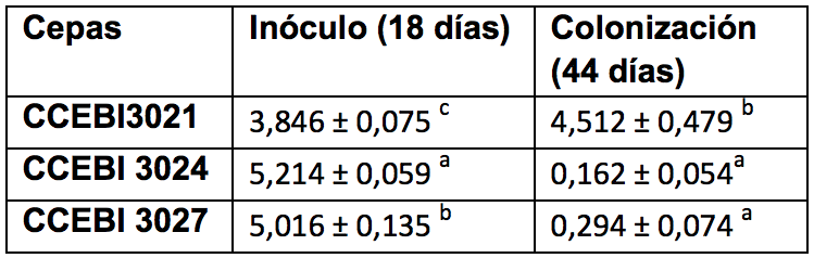 En este trabajo se realizaron determinaciones de actividad lacasa en diferentes fases del proceso de cultivo. Se obtuvo que la cepa con mayor actividad lacasa en inóculo fue la cepa CCEBI 3024, con valor de 5,214 Ug-1, muy similar a la CCEBI 3027 (5,016 Ug-1), pero estadísticamente diferentes y superiores a la 3021 (3,846 Ug-1). Por primera vez se refiere la determinación de la actividad lacasa a nivel de inóculo. Ver tabla. En ella se presentan los valores promedios de tres réplicas ± la desviación estándar. Letras iguales para un mismo parámetro, refiere no existencia de diferencias estadísticas significativas entre las medias de las cepas. (α=0,05).