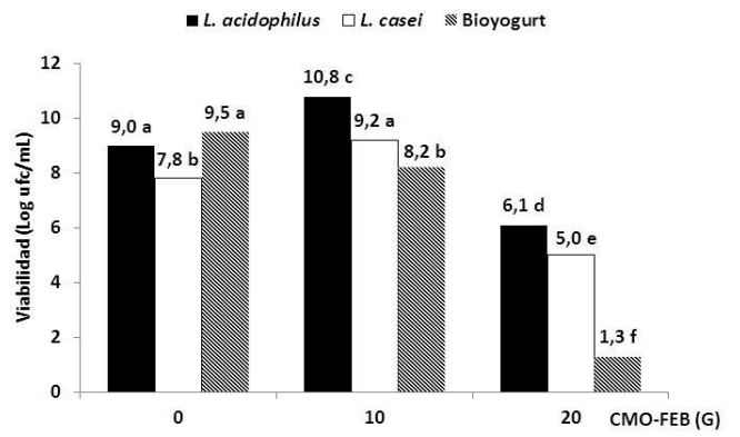 Al aplicar CMO-FEB de 10 G las cepas puras L. acidophilus y L. casei incrementaron su viabilidad en relación con los controles (aumento de 1,8 y 1,4 Log ufc/mL, respectivamente). Sin embargo, con 20 G la viabilidad de ambos cultivos decreció cerca de 3 Log ufc/mL por debajo del control. Este resultado sugiere que valores superiores de densidad de CMO pudieran inhibir el crecimiento indicando que debe aplicarse en tiempos menores, lo cual es favorable para su aplicación en la industria. Se plantea que debido al CMO-FEB las bacterias podrían generar diferentes respuestas metabólicas en el cultivo y perjudicar la simbiosis /5, 6/.
