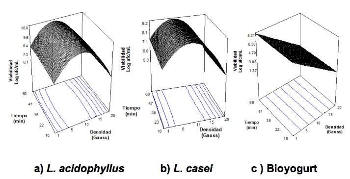 En sentido general la optimización numérica del diseño indicó que 35 min y 10 G es el régimen de tratamiento magnético óptimo para alcanzar la máxima viabilidad. En cuanto el efecto estimulante del L. acidophilus . L. casei fue superior (incremento de 1,8 y 1,4 Log ufc/mL, respectivamente) al cultivo de Bioyogurt (1,3 a 8,2 Log ufc/mL) siendo que este último nunca superó al valor control (9,5 log ufc/mL).