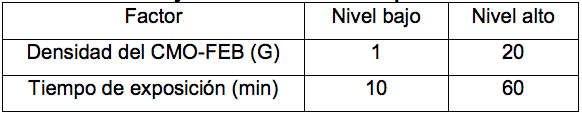 Posteriormente se realizó un diseño de experimento D-óptimo de superficie respuesta por el programa Desing Expert (versión 6.0.1). Para los niveles de los factores densidad del CMO-FEB (G) y tiempo de exposición (min) se tuvo en cuenta los resultados de la etapa anterior (tabla 1). Se obtuvieron doce variantes experimentales, que se aplicó a cada cultivo para un total de 36 corridas.