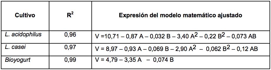 La tabla 3 muestra el comportamiento de la viabilidad para los tres cultivos prebióticos en la segunda parte del experimento. En todos los casos el comportamiento microbiano se ajustó a ecuaciones matemáticas que explican más del 96 % de su comportamiento (R2 = 0,96 a 0,99). La viabilidad del cultivo de L. acidophilus y L. casei se ajustó a ecuaciones cuadráticas y la del Bioyogurt a una ecuación lineal. De forma general se destaca que en los tres modelos matemáticos existen diferencias significativas (p ≤ 0,05) de la viabilidad con respecto a la densidad de CMO (A), pero no significativas (p ≥ 0,05) con relación al tiempo de exposición (B).