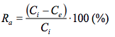 La eficiencia o porcentaje de adsorción de ión metálico (Ra) se determinó por la ecuación: