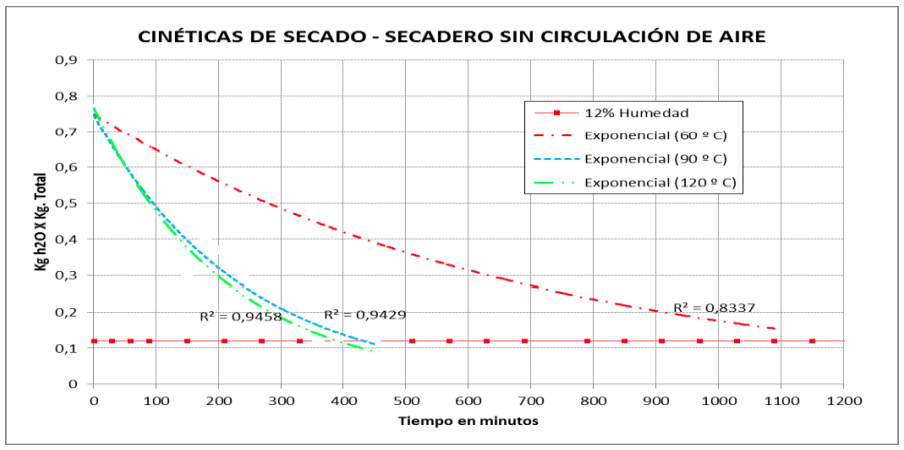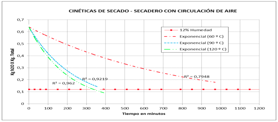 Ambos secaderos trabajaron a las mismas temperaturas, 60, 90 y 120 ºC con el objetivo de analizar la cinética de secado en las diferentes condiciones de circulación de aire, en ambos casos el material fue colocado directamente sobre las bandejas, con un espesor de 5 mm. Con el fin de que la evaporación del agua se de en iguales condiciones para las muestras evaluadas, la pérdida de humedad fue medida en relación al peso inicial y final de la muestra después de ciertos periodos regulares de tiempo, hasta alcanzar la humedad estimada para este tipo de productos la cual es del 12 % de humedad.