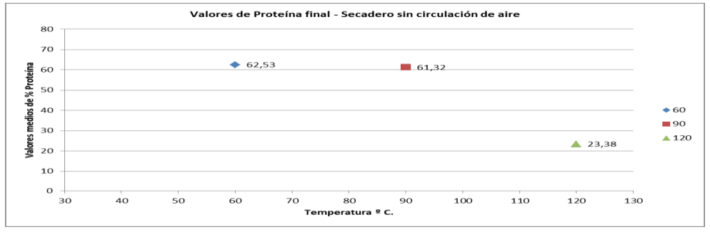 Se evaluó además el valor del contenido final de proteína como indicador para cada una de las temperaturas probadas, en el secadero sin circulación del aire.